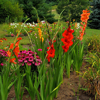 We very fortunate to inherit several flower beds from the Fairs (who owned the property for 50 years before us). Mrs. Fair had planted several varieties of ornate, colourful lilies in shades of orange, yellow, red and pink along the east and west sides of the house. These continue to come up in the first half of the summer and put on a dramatic show. Another gift are the beds of Peonies that bloom around the same time. Continuing the tradition, Ray has spent hours on the beds to the east side of the house planting and maintaining a large variety of flowers that bloom at various stages throughout the summer. These include Zinnea, Gladioli, Blue Cornflower, Echinacea, Daisy, Gaillardia, Black Eyed Susan, and Snapdragon to name a few.
